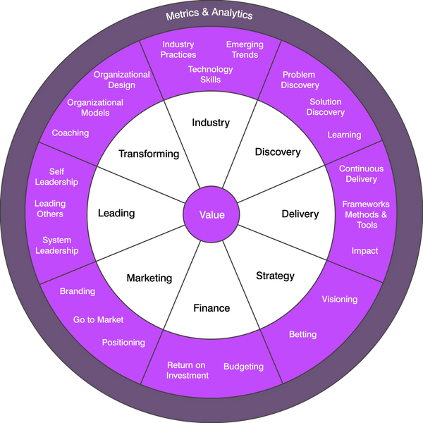 The Growth Wheel consists of eight core competencies built around a central hub of value, with an outer ring focused on metrics and analytics. These areas cover everything from understanding industry trends and driving product strategy to fostering innovation and leading transformations. By using the wheel, coaches can reflect on their strengths and continuously adapt to meet the evolving demands of product-led organizations.